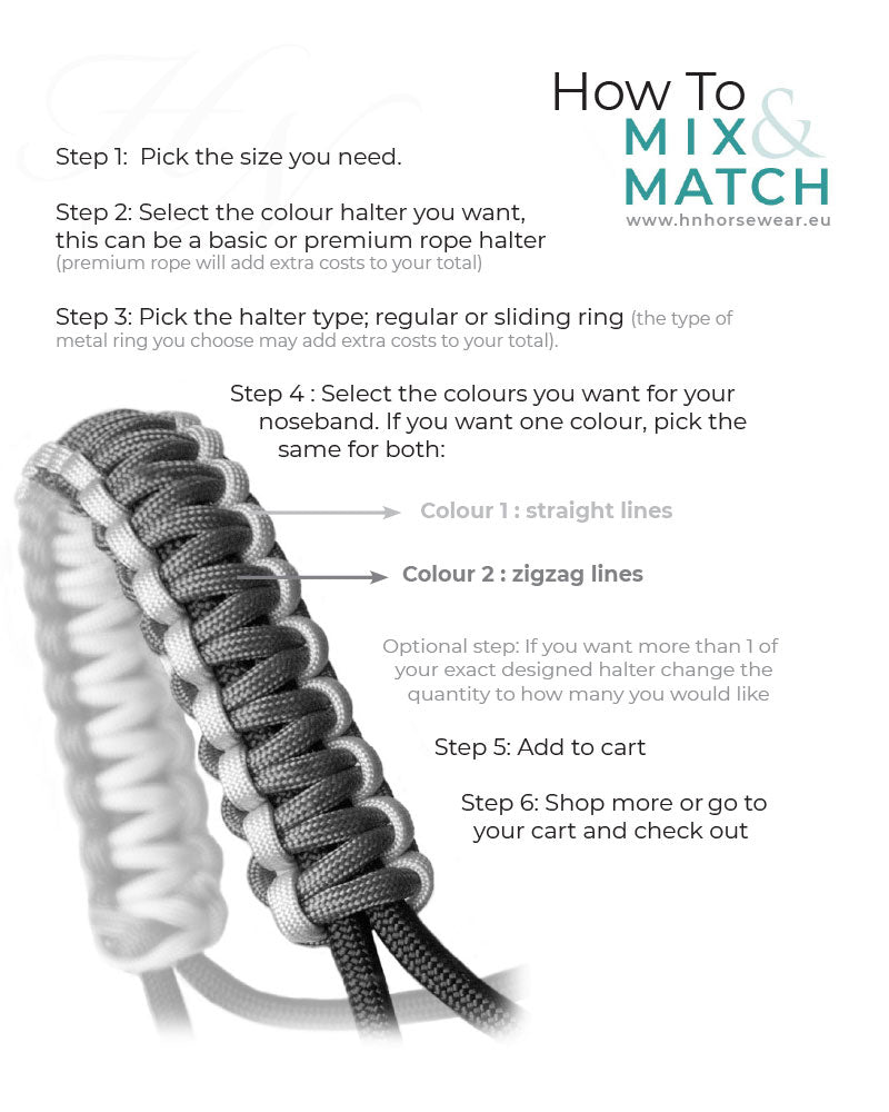 Mix & Match your favourite colours to design your own knotless rope halter with Cobra braided noseband! The Cobra braided noseband can contain up to 2 different colours and has a softer impact on the nose. This version has thicker rope to better fit those chunky horses.