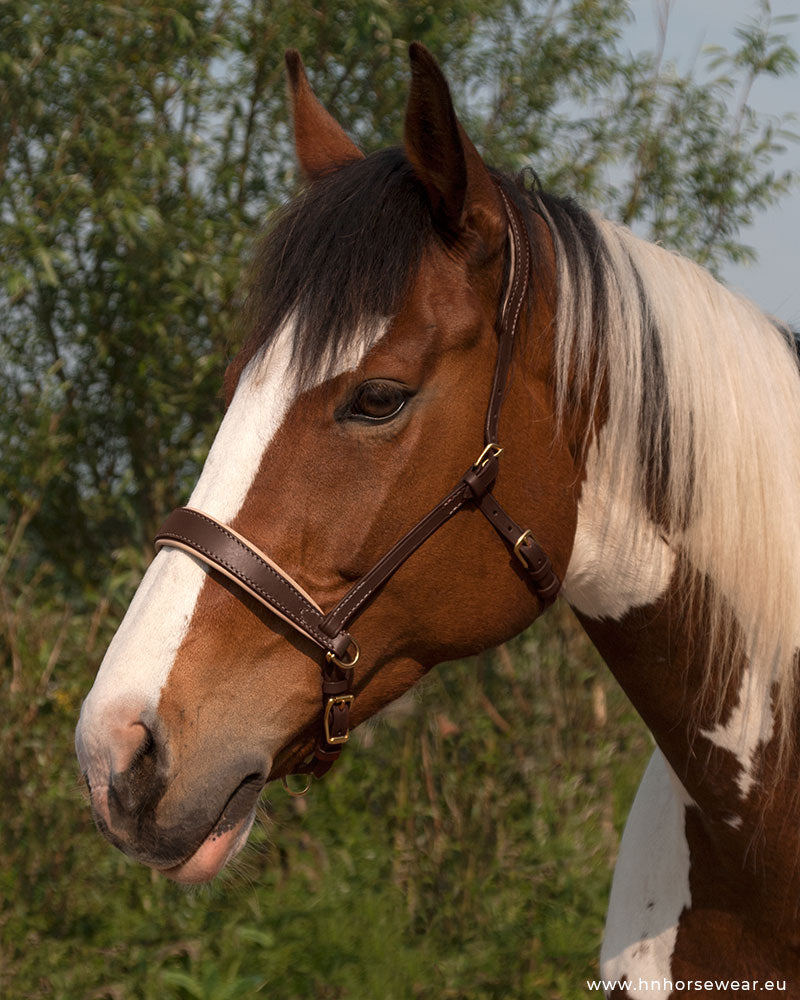 This sidepull comes in 2 standard variations black and dark brown with your choice of hardware or customize your bridle with different bridle-, padding and stitching colours.